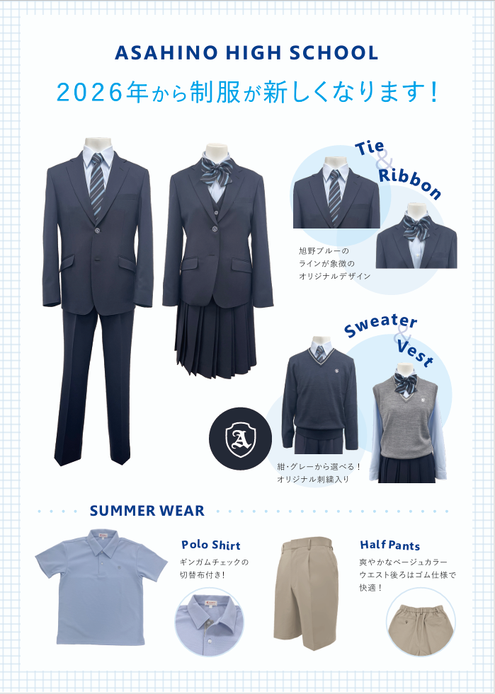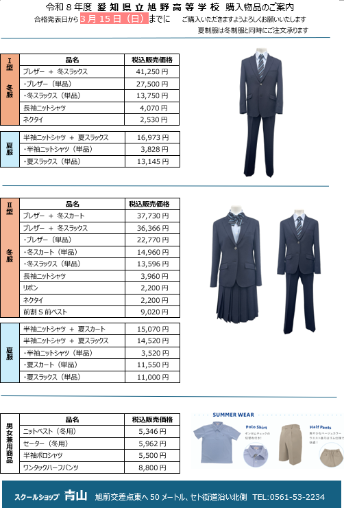 スクールショップ青山では、2026年度「愛知県立旭野高等学校」新入生の制服の注文を承っております。